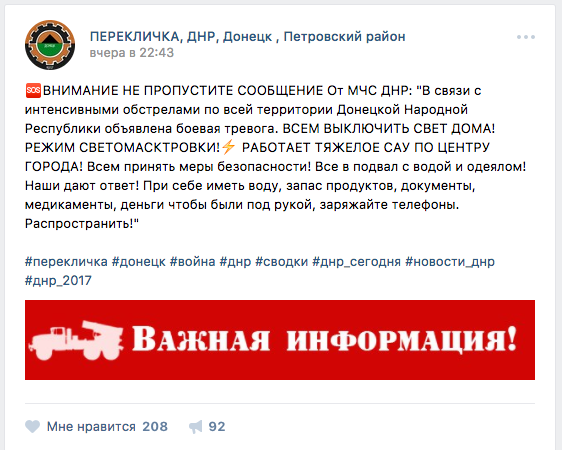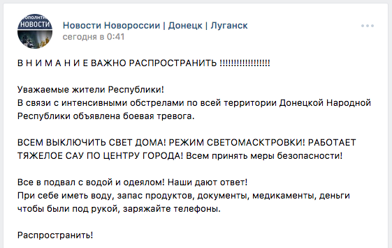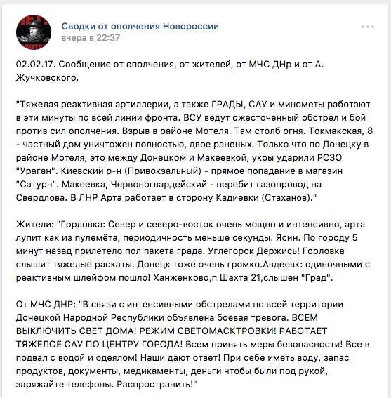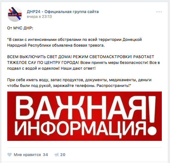 Вечером в четверг, 2 февраля, многие просепаратистские сообщества в соцсетях опубликовали заявление якобы от МЧС ДНР об объявлении боевой тревоги с призывом выключить свет в домах из-за «режима светомаскировки». Также авторы публикаций призывали местных жителей спрятаться в подвалах.