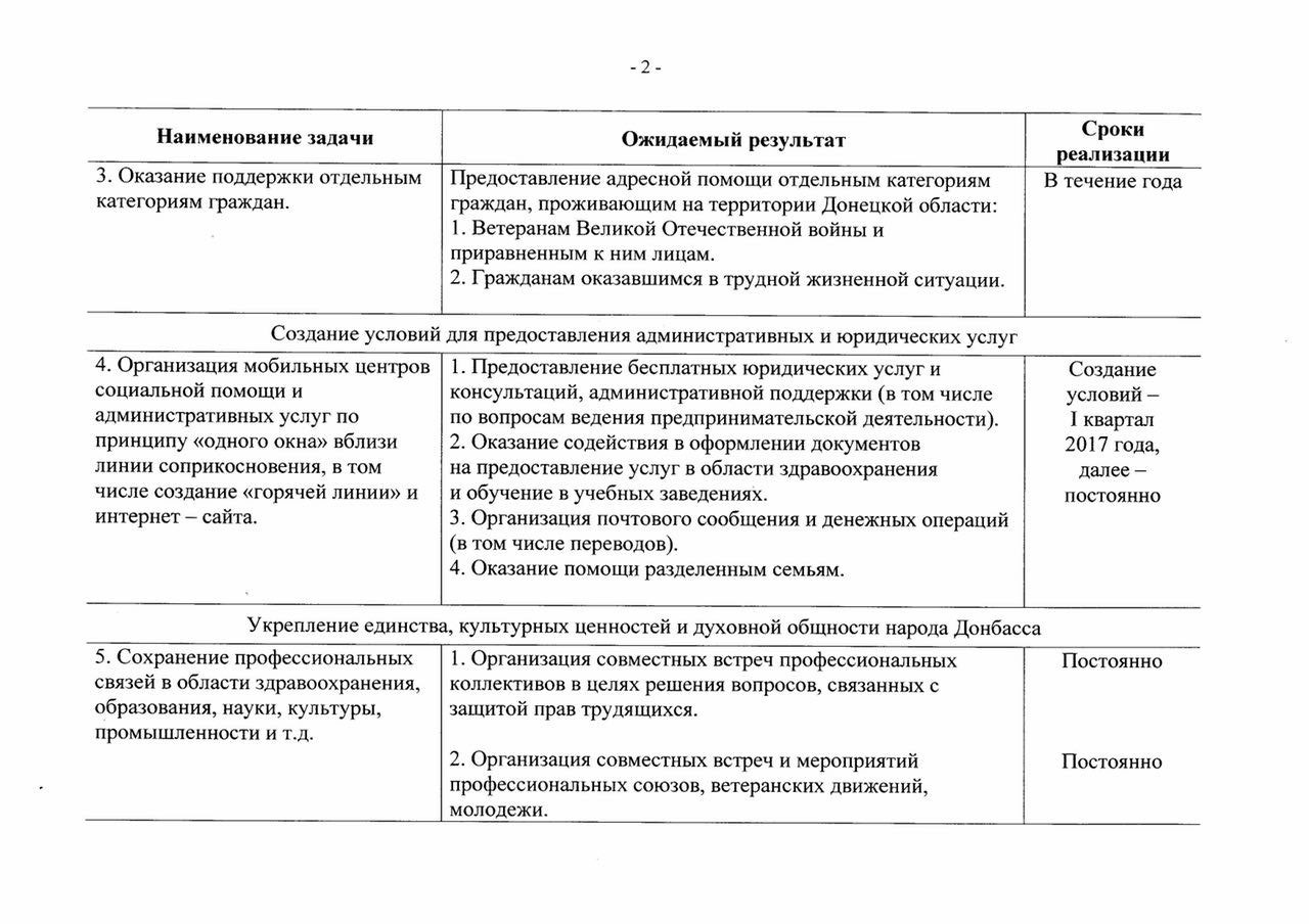 Согласно тексту программы, утвержденному главой ДНР, в 2017 году власти самопровозглашенной республики планируют помогать жителям части Донецкой и Луганской областей в медицинской, образовательной и культурных сферах, а также хотят обеспечить адресную помощь некоторым льготным категориям.