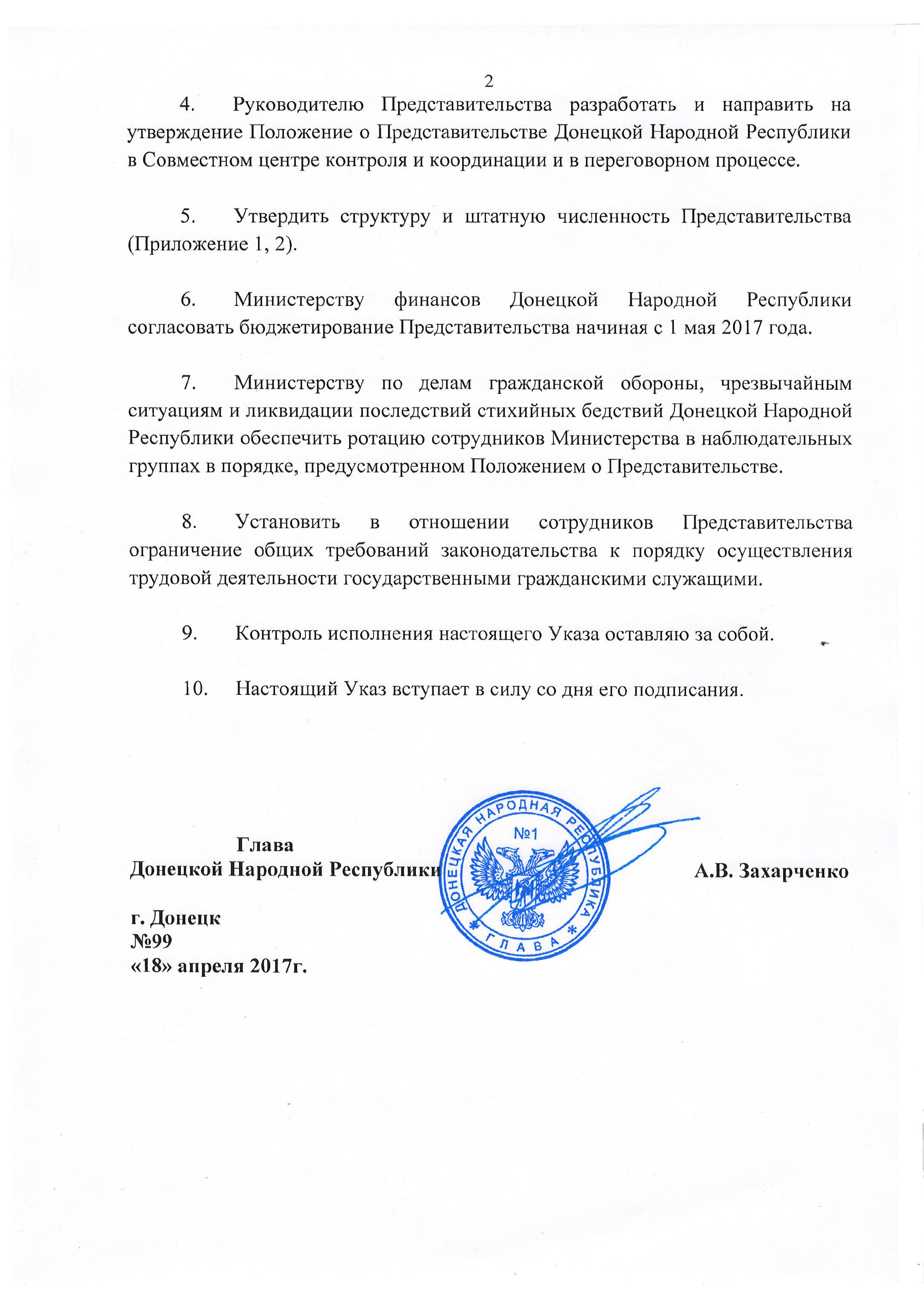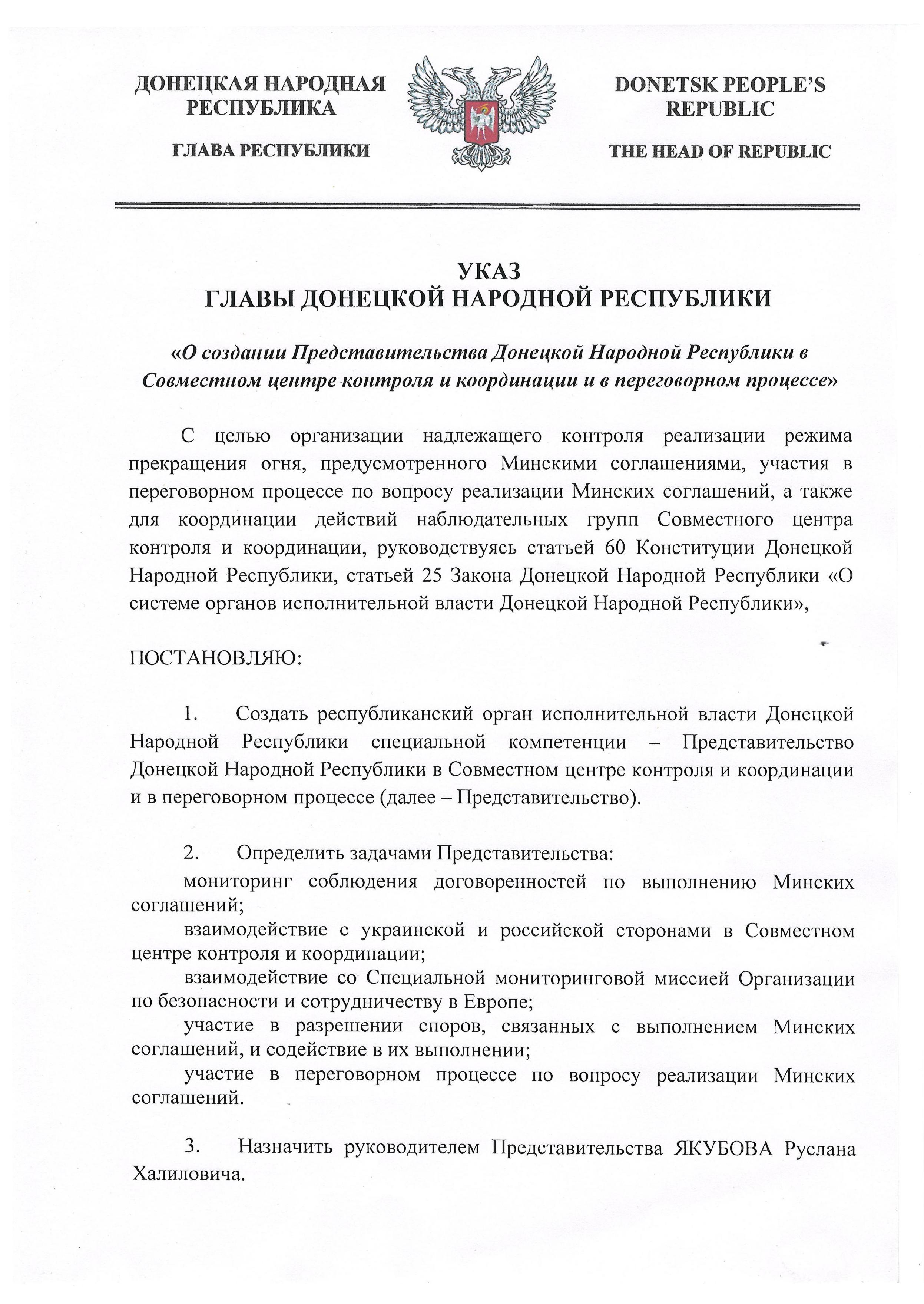 Руководителем представительства стал начальник штаба оперативного командования ДНР Руслан Якубов. Контроль за исполнением указа Захарченко оставил за собой. Документ вступил в силу с момента подписания — 18 апреля.
