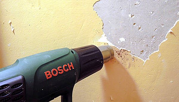 Также не лишним будет запастись набором инструментов, которые помогают быстро и эффективно удалить старую краску со стеновых поверхностей перед дальнейшим выравниванием и отделкой. Надо приобрести в арсенал специализированный строительный фен, который подаёт на стену струю горячего воздуха. Также в перечень включаем: