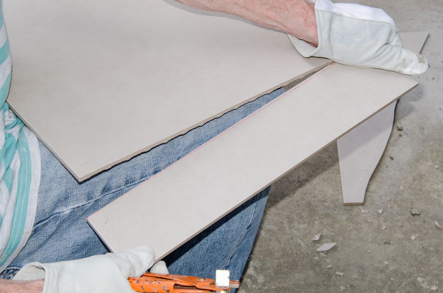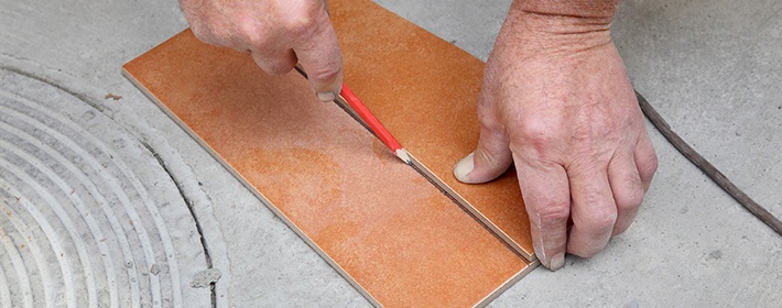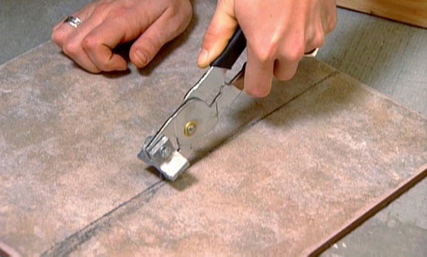 - Самый простой из них – это отрезать плитку стеклорезом. Желательно использовать стеклорез с алмазным наконечником. Но и обычный инструмент, с колёсиками из вольфрамового сплава, вполне подойдёт. Сначала выполняют разметку. Потом плитку укладывают на ровную поверхность и стеклорезом с усилием проводят линию реза. Затем плитку отламывают по этой линии. В этом процессе самым ответственным является момент излома. Существует высокая вероятность того, что плитка отломится не по линии реза.