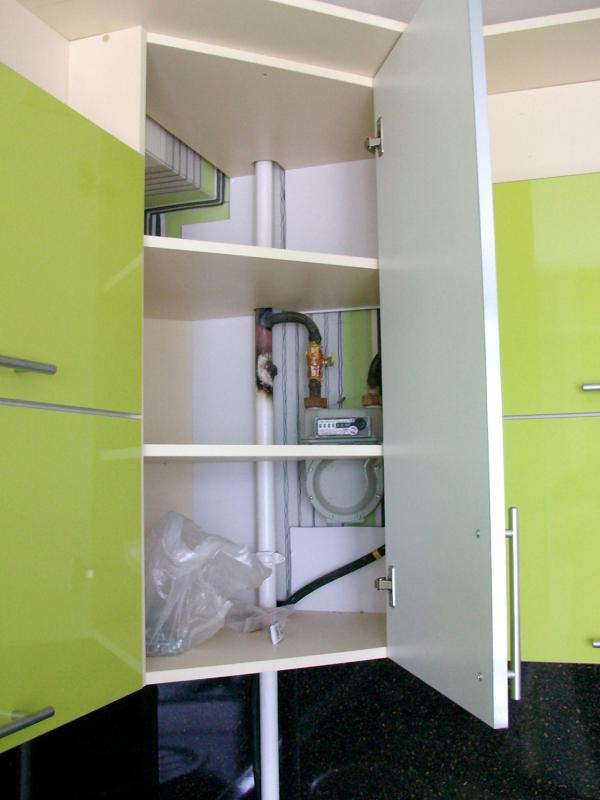 • Убрать коммуникационные сети в кухонную мебель. Если стояк расположен близко к стене, у шкафчика убирается задняя стенка. Мебельный фасад является хорошей маскировкой. Газопроводная система, проложенная сверху, под потолком, скрывается навесными шкафчиками.