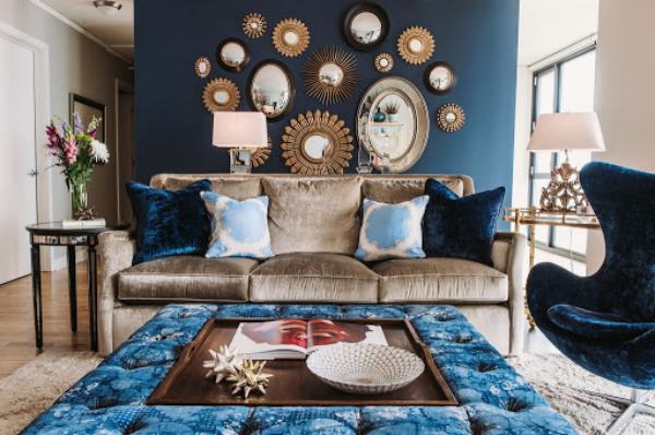 Эти два цвета являются контрастными, поэтому должны отлично сочетаться, но всё зависит от того, какую роль они играют в интерьере. Если декоративную: для оформления текстиля, в узоре штор, картины, панно, то сочетание будет вполне уместным и сдержанным. Если же использовать их в облицовке или оформлении мебели, то эффект будет слишком ярким. Пребывание в такой комнате будет сильно раздражать глаза, что особенно противопоказано в оформлении помещений для сна и рабочего места.