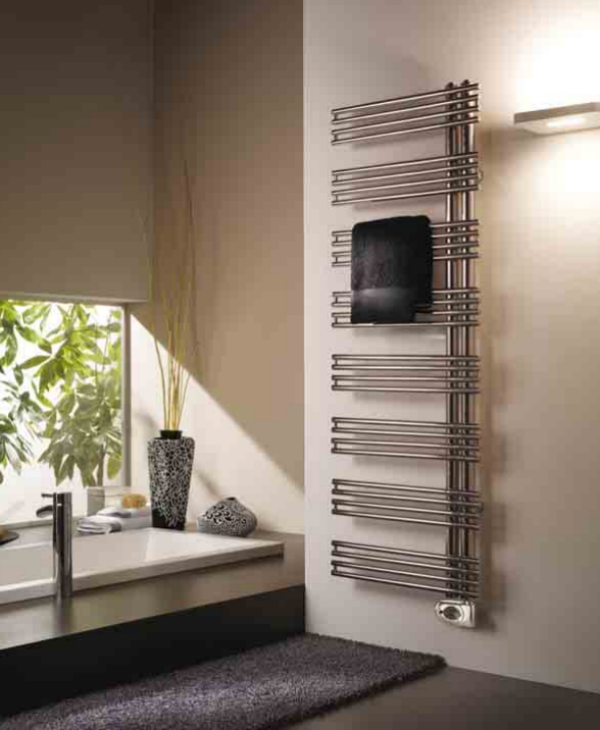 Стандартно в ванных комнатах устанавливается водяной полотенцесушитель, но это очень дорого и неудобно. Для него необходимо устанавливать дополнительные трубы, обычно он запроектирован в определенном месте. В отличие от водяного, электрический полотенцесушитель можно установить где угодно, его положение зависит только от вашей фантазии, а не от натянутых труб, работает этот агрегат от розетки и его при необходимости можно отключать, когда он не нужен. По итогу такой вариант дешевле как при установке, так и при обслуживании.