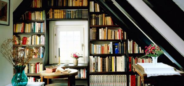 В случае, когда места для книг не хватает, то приходится использовать каждый сантиметр имеющейся площади. Стеллажи для книг можно устроить на углах комнаты, а также использовать свободное место под потолком. Любимая библиотека, расположенная в гостиной над диваном, в спальне над кроватью или над входной дверью, станет прекрасным выходом в малогабаритных квартирах.