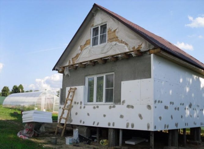 Данный утеплитель считается одним из самых популярных на сегодняшний день. Это связано с тем, что изделия имеют небольшую стоимость, при этом утепление вы получаете качественнее. Чем выше плотность, тем лучше. Пористость позволяет сделать утеплитель легким, что не создает нагрузку на стены и фундамент дома. Приобрести пенопласт можно в любом городе. Основной минус в том, что воздействие ультрафиолетового излучения может стать причиной деформации утеплителя. Лучше всего использовать специальную защиту. В таком случае утепление прослужит более, ч5м 50 лет.