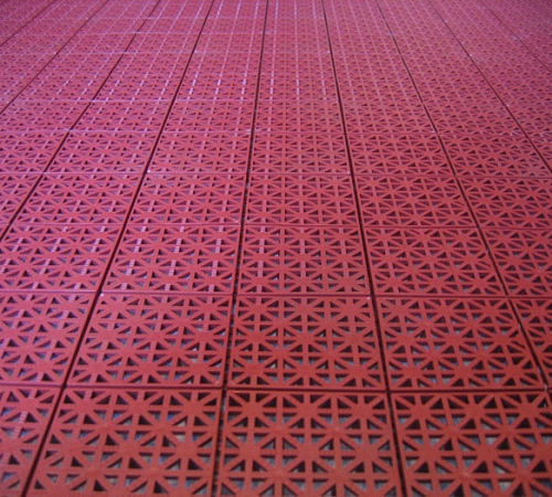 - Модульное покрытие. Оно также называется перфорированным. Главная особенность в том, что материал имеет сквозные продольные или поперечные прорези. Размеры плиток могут быть разными. Обычно размеры 30 на 30 и 50 на 50 см. Обратите внимание на толщину. Самый оптимальный вариант – это не менее 1,5 см. Устанавливать плитки легко, так как имеет специальная система шип-паз. Покрытие получается прочным и качественным;