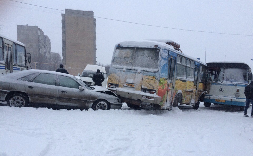 В горловском 88 квартале днем в пятницу, 13 января, произошло массовое ДТП из-за неочищенных от снега дорог. В аварии несколько автобусов столкнулись с