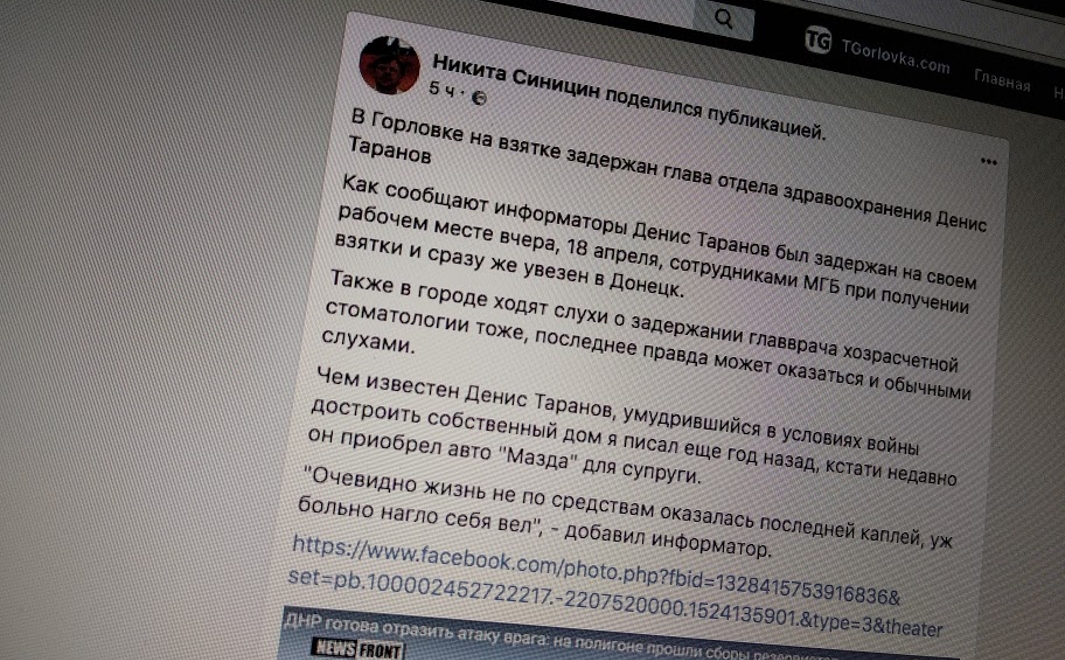 Глава отдела здравоохранения мэрии Горловки Денис Таранов был задержан сотрудниками МГБ во время получения взятки в среду, 18 апреля, рассказал в своем