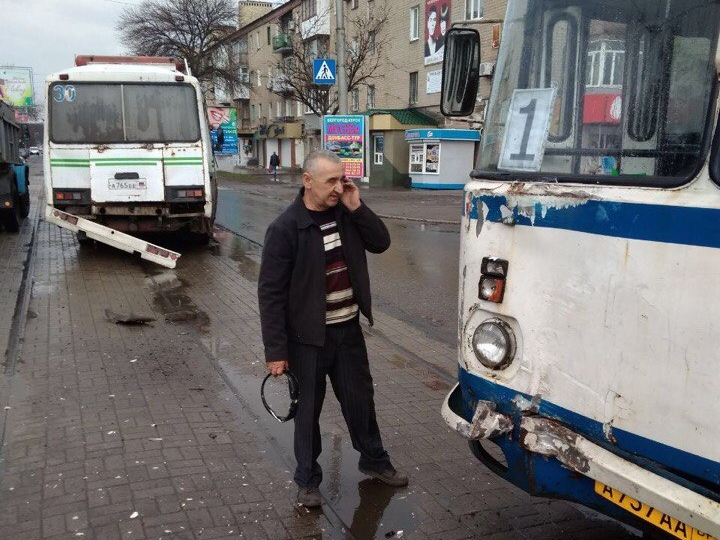 В понедельник, 16 апреля, в центре Горловки на пересечении ул. Гагарина и пр. Победы произошла авария — столкнулись два автобуса. Об этом на своей странице