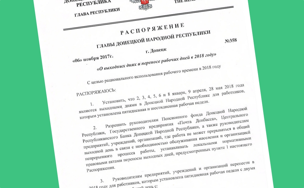Глава ДНР Александр Захарченко подписал распоряжение об установлении выходных дней на 2018 год для работников организаций и предприятий на территории самопровозглашенной