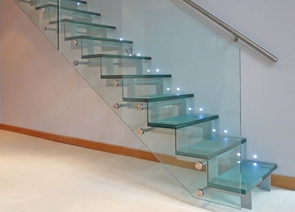 Благодаря новейшим технологиям не так давно стало возможным использование стекла в качестве ступеней на лестницах. Такая конструкция создает уникальный